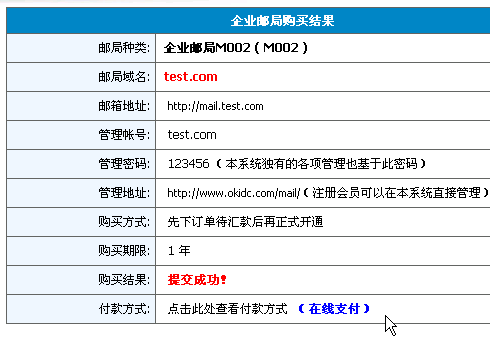 此时您将看到订单提交的结果,如果您的帐户上有足够款项,并且您选择的注册方式是"正式购买",那么邮局将马上开通成功并扣除购买款项,如果您选择的开通方式是"只交订单",那么空间并没有真正开通,只是提交到了我们的申请订单里,这时,您需要按